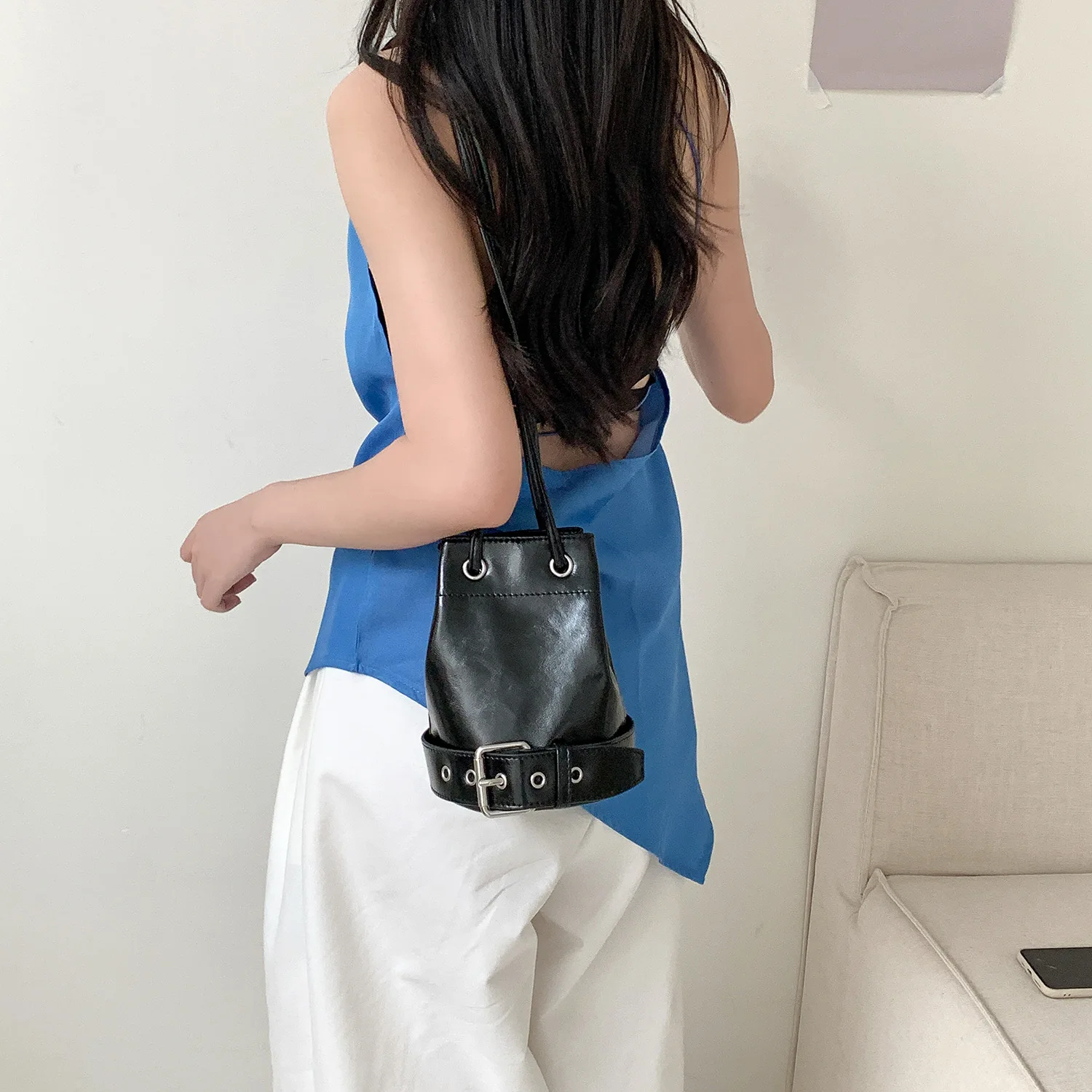 2025 Autumn Casual Drawstring Ruffles Cylinder Shoulder Bags High Quality Waterproof Handbags Mini Crossbody Bags for Women