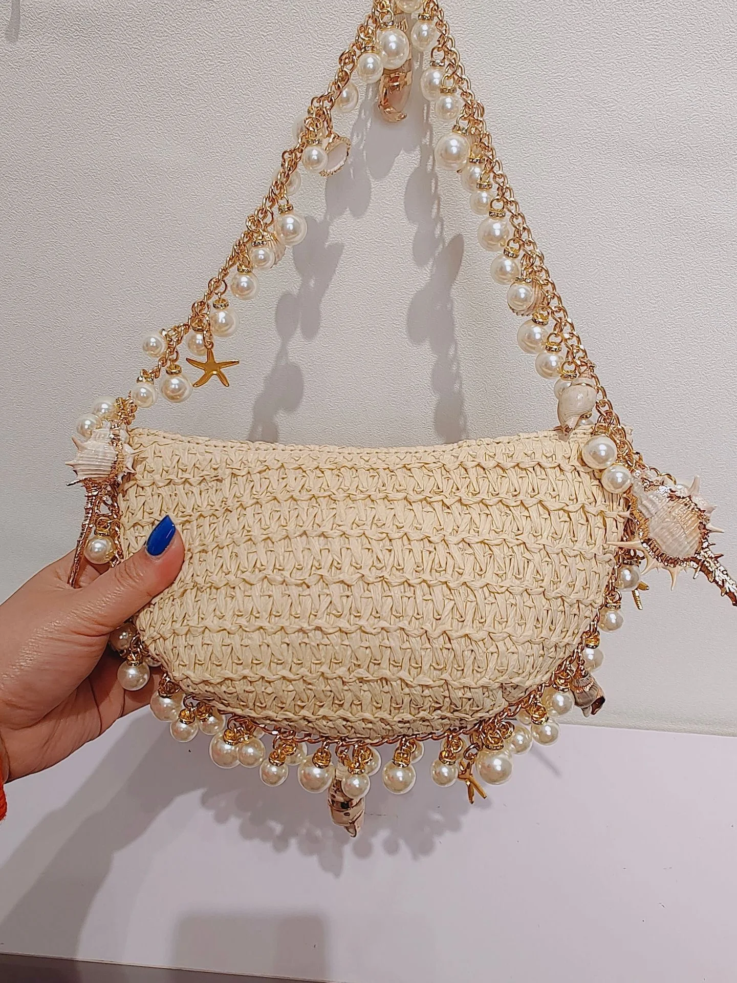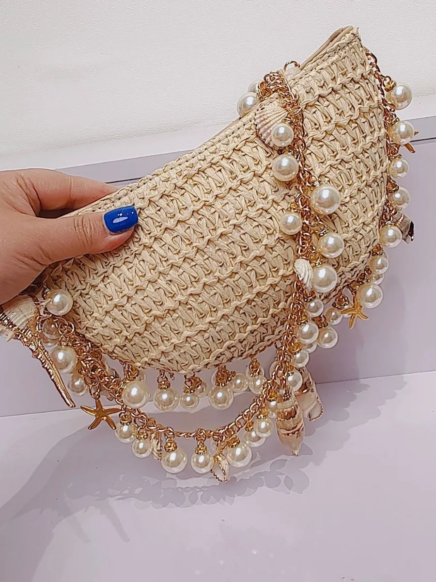 2025 Fashion Spring and Summer Pearl Conch Straw Braided Handbag New Woven Bag with Pu Material