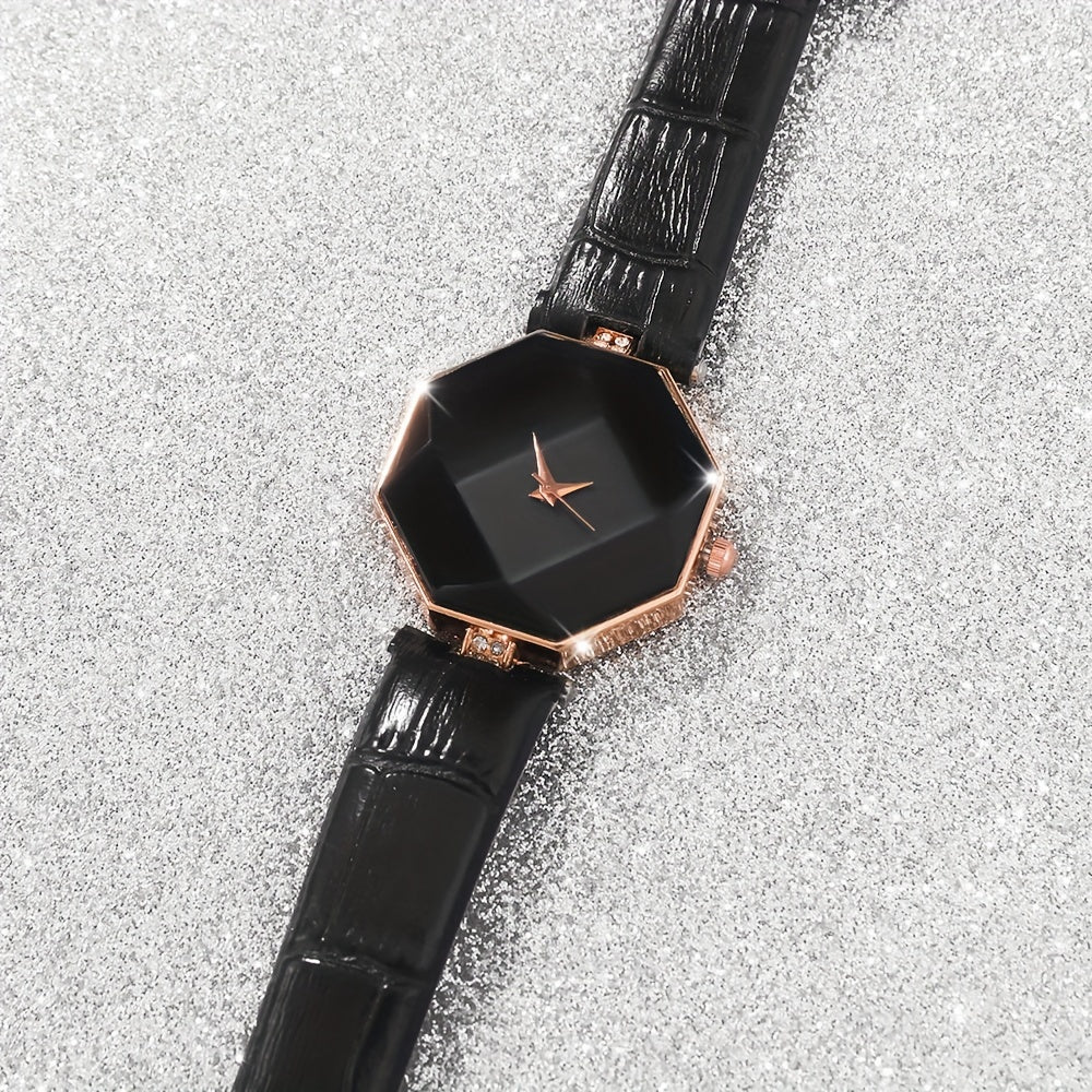 2pcs/set Fashionable Personalized Polygonal Women's Quartz Watch, Eye-Catching Black Design, Zinc Alloy Case, Soft Leather Strap And Heart-Shaped Bracelet, Ideal Gift For Mothers Or Girlfriends On Mother's Day, Valentine's Day, Ramadan, And Birthdays