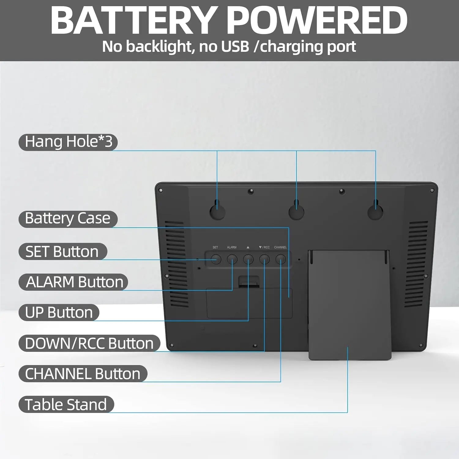 The battery atomic wall clock is supported by 4xAA battery and outdoor sensor is supported by 2xAAA battery. (Batteries Not Included)