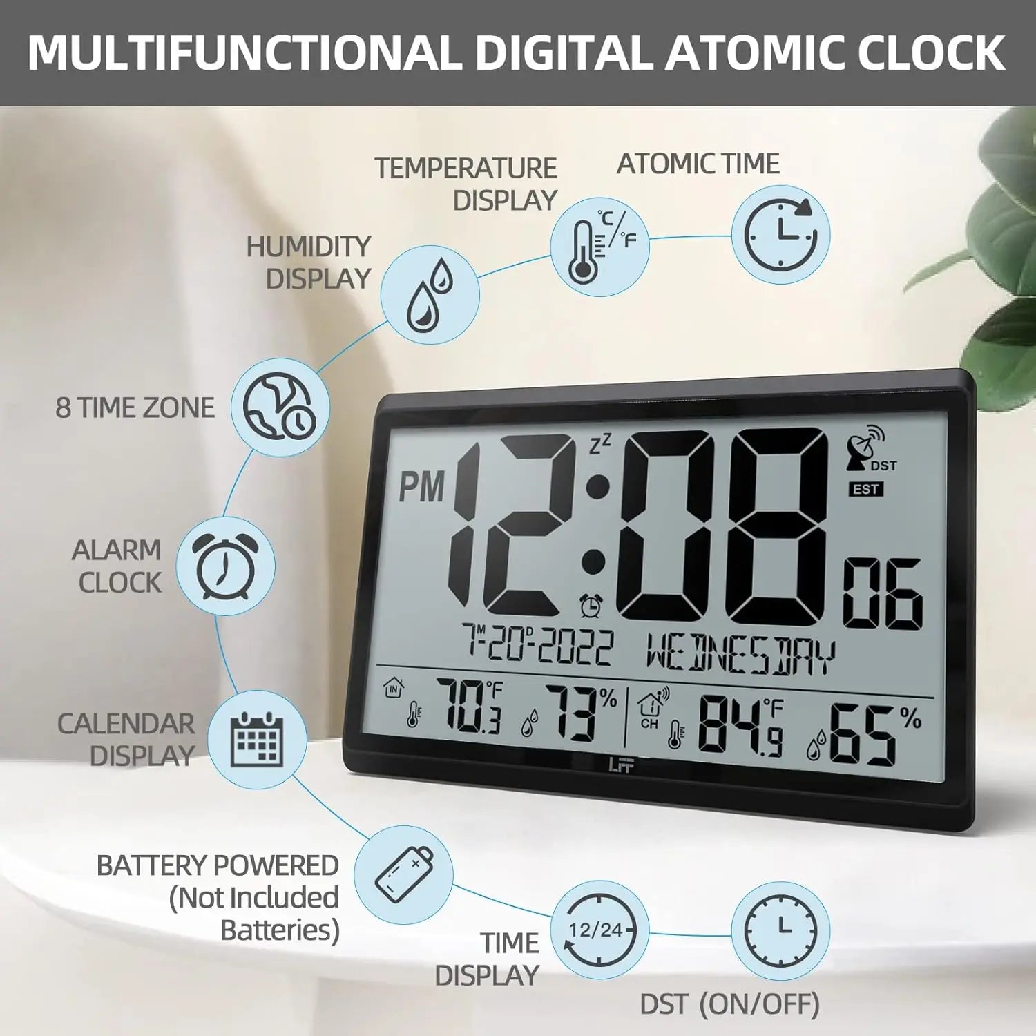 Atomic clock with big numbers, making it easier for family members to know the time, date,week, indoor / outdoor temperature and humidity.
