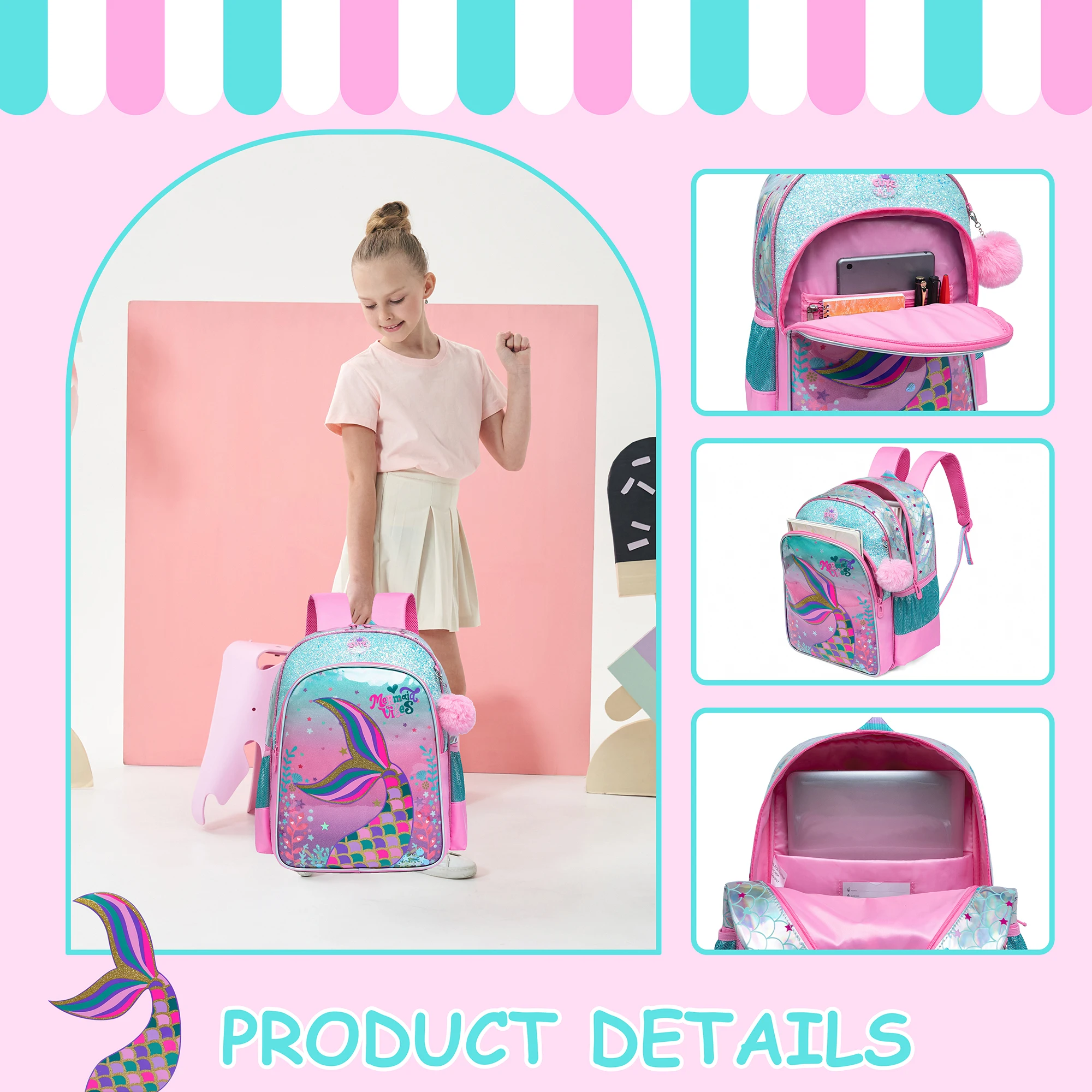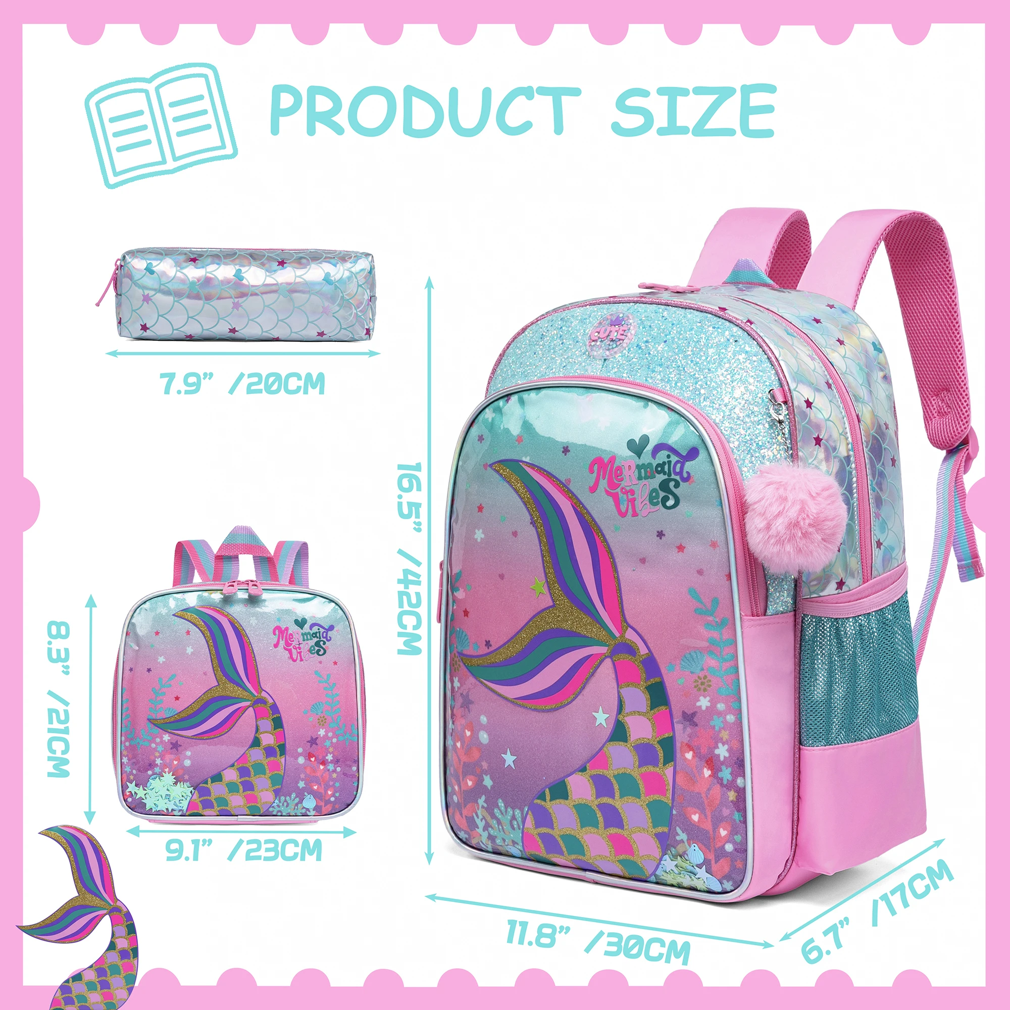 [Capacidade da mochila escolar infantil] Conjunto de mochila escolar sereia que inclui mochila para adolescentes, lancheira e estojo para lápis, mochila contém 1 bolso principal grande com 1 bolso para laptop, 1 bolso frontal para blocos de notas; óculos; etc., e 2 bolsos de malha para garrafa;