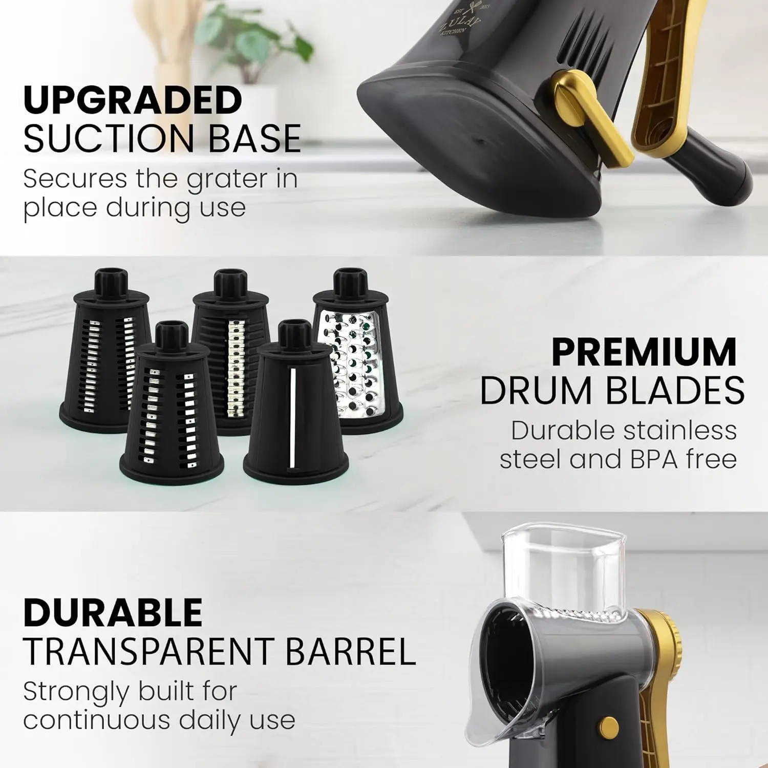 Rallador de queso Trituradora de queso de 5 hojas - Rallador de queso manual con manivela con succión reforzada y 5 tambores intercambiables - Fácil