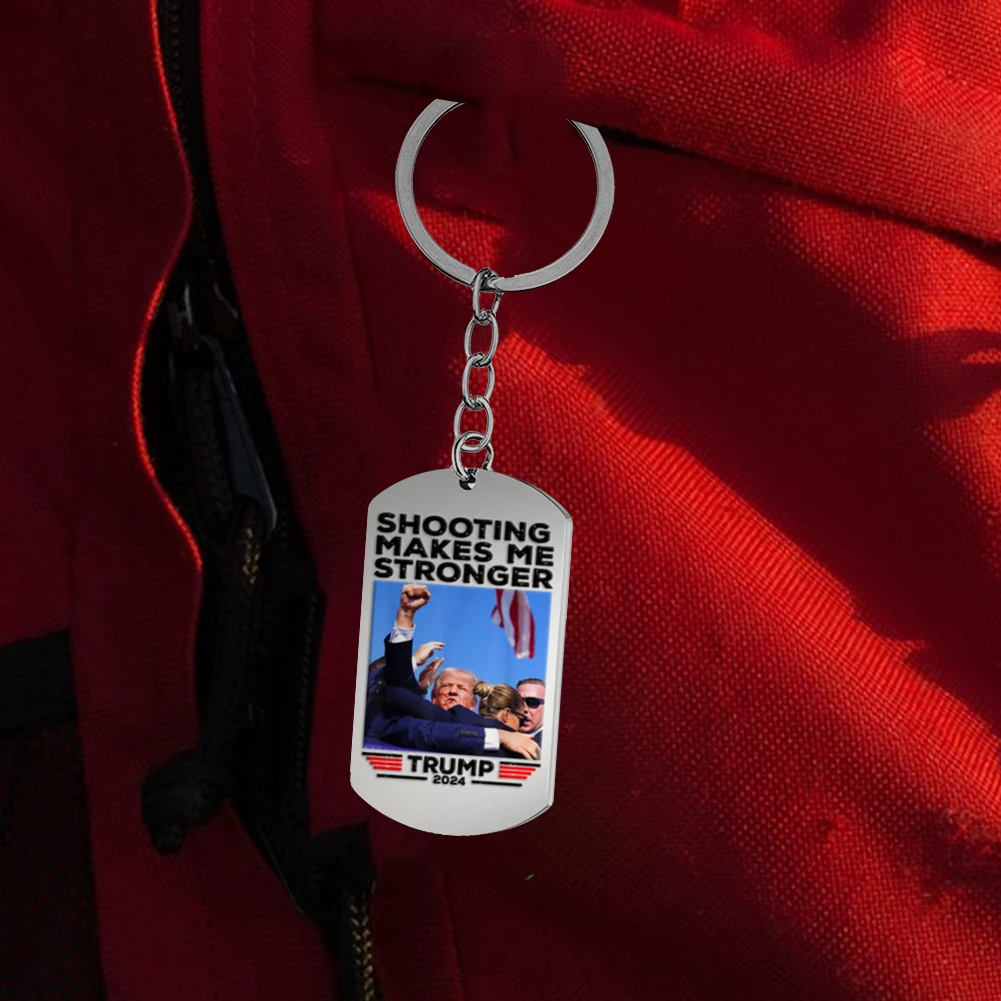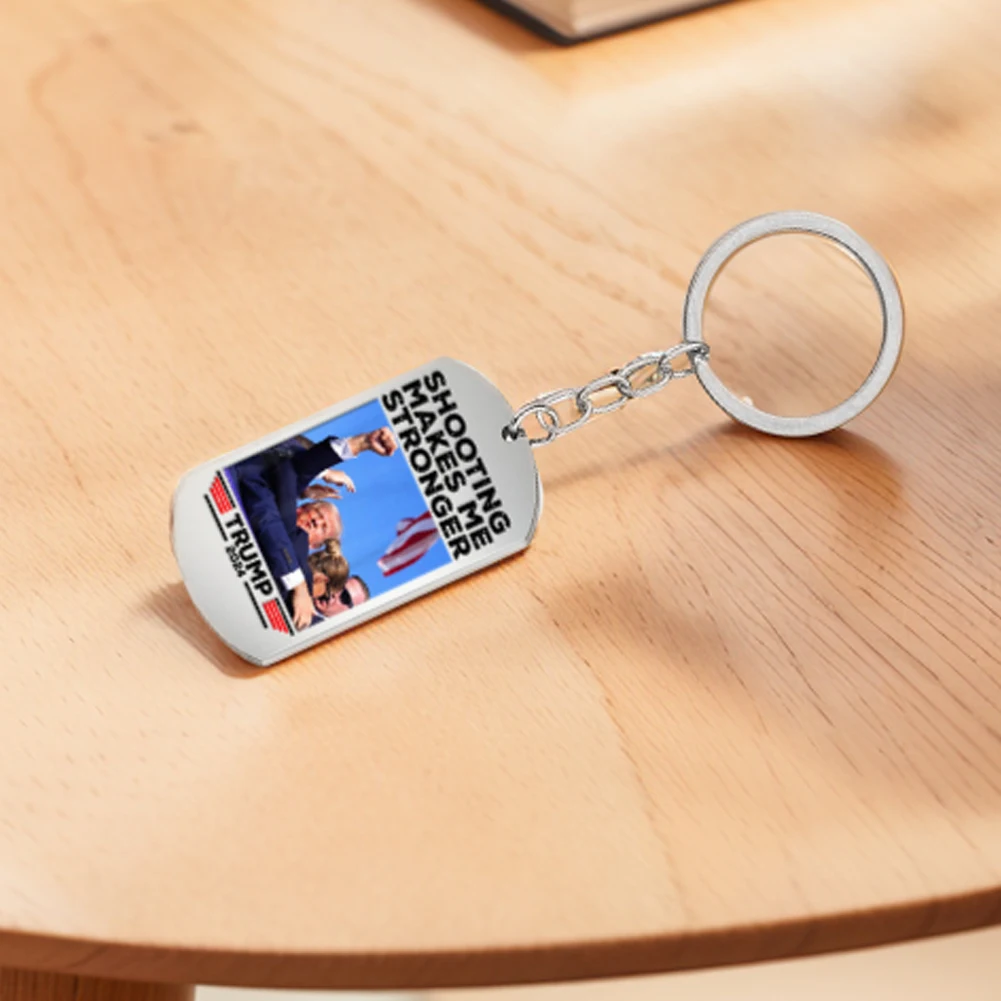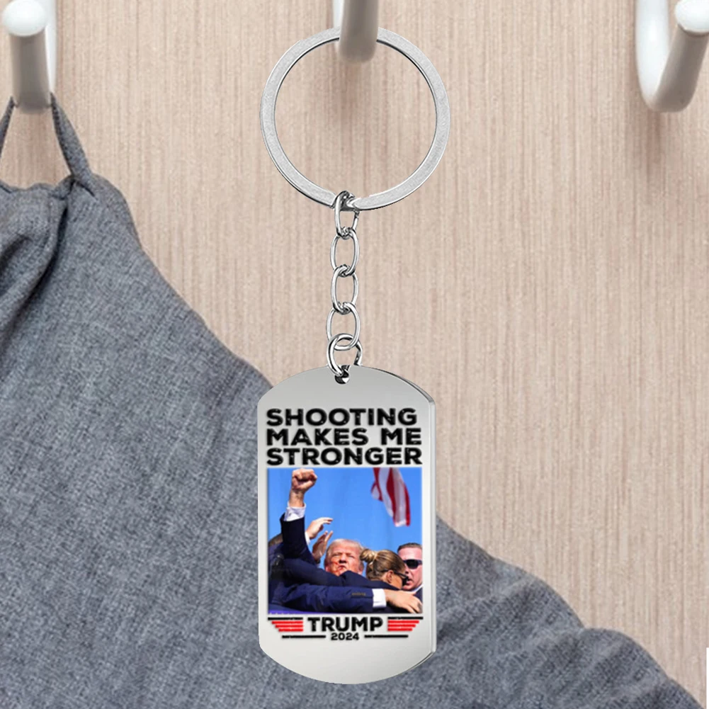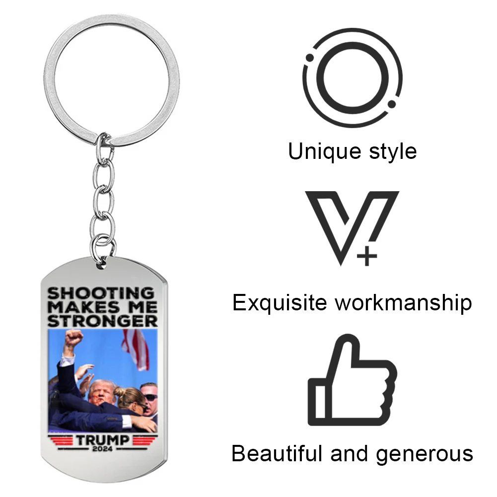 Trump 2024 Flag Keychain Stainless Steel Shooting Makes Me Stronger Pendant Key Chain for Men Women Gifts for Supporters Fans Feature: