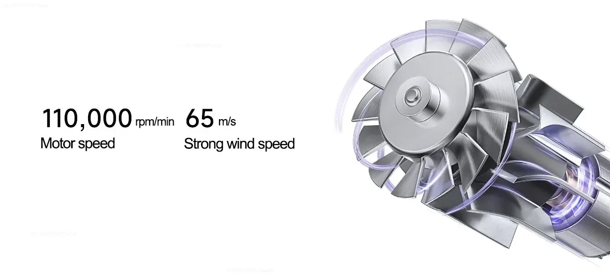 * 110,000 RPM High-Speed Motor: Delivers a powerful wind speed of 65 meters per second for quick drying.